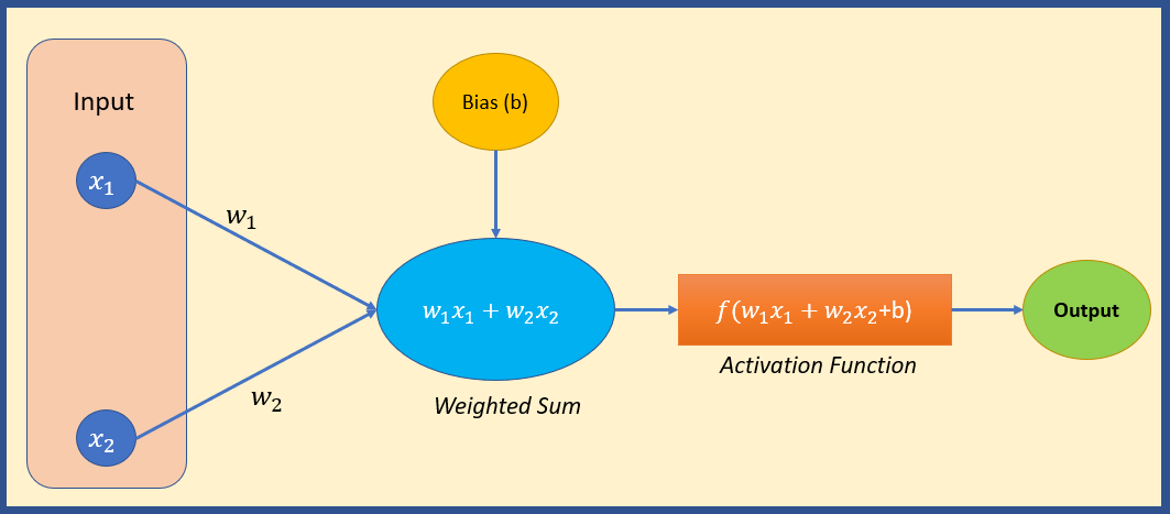 In the diagram below, weights are represented as w1 and w2 and bias is represented as b respectively.