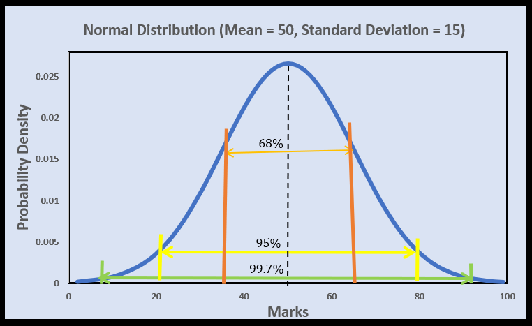 Suppose, we have a dataset containing marks of 50 students and it follows a Normal distribution with mean = 50 and std_dev = 15