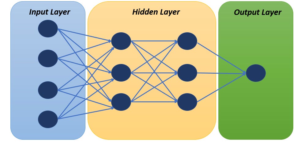 There are primarily three types of layers in a neural network: Input Layer, Hidden Layer and Output Layer.